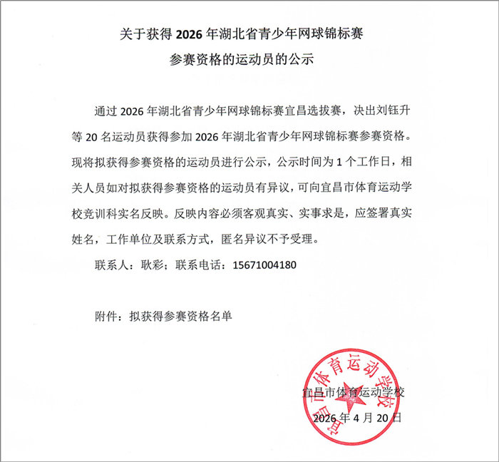 关于参加2026年湖北省青少年网球锦标赛宜昌选拔赛人员名单的公示