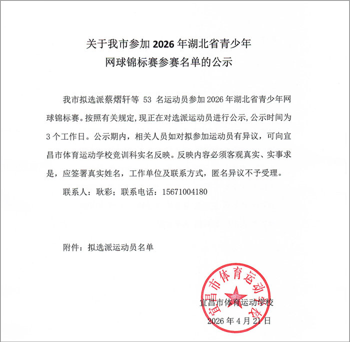 关于我市参加2026年湖北省青少年网球锦标赛参赛名单的公示