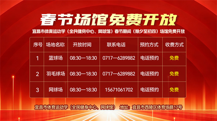 宜昌市体育运动学校(全民健身中心、网球馆)春节期间(除夕至初四)场馆免费开放,详情如下: