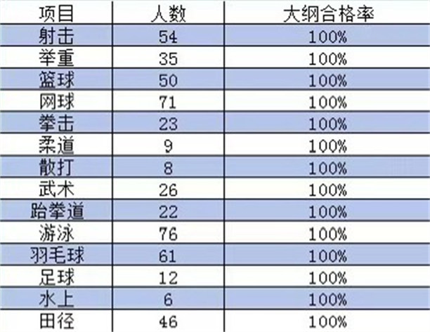 图1-5 湖北省第十六届运动会女子举重甲组团体冠军 2.文化课成绩 在2024年6月份的中职教学质量监测考试中,学校中一年级参考人40人,语文学科合格率95%,数学学科合格率90%,英语学科合格率82.5%。 学校中二年级参考人43人,语文学科合格率90.7%,数学学科合格率79.10%,英语学科合格率79.1%。 3.项目测试和体能测试 2024年3月,根据上级要求和基地建设需要,学校严格按照计划和测试标准,对14个项目运动员进行测试工作。测试内容包括基本素质体制测试、生理生化测试以及转项技能等小项目的测试,参加测试运动员499名,合格率达到100%。参加全国学生体质测试共计99名,合格率达到94%。 数据分析图1-3 运动员大纲测试数据分析