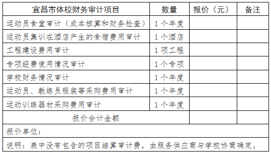 宜昌市体育运动学校购买财务审计服务,拟进行询价采购,邀请符合条件的供应商参与报单价投标。 一、采购项目编号:YCTXCWSJ-2023-01 二、采购项目名称:宜昌市体育运动学校财务审计及清产核资。 三、采购项目内容 1.根据《宜昌市直属学校托管食堂财务管理办法(试行)》的通知(宜教规〔2019〕1号 )要求,对宜昌市体校运动员食堂成本核算和财务检查。具体为成本核算、成本比例审查、结算审查、财务规范检查服务外包。 2.对宜昌市体校运动员集训在酒店食宿发生费用的核算和结算审查。 3.对宜昌市体校工程建设费用的清产核资和结算审查。 4.对宜昌市体校专项经费的使用核算和结算审查。 5.对宜昌市体校年度财务收支和资产等清产核算和结算审查。 6.对宜昌市体校运动员、教练员服装等年度采购费用核算和结算审查。 7.对宜昌市体校运动训练器材年度采购费用核算和结算审查。 8.其它。 四、投标人资格要求 1.投标人应是中华人民共和国境内依法注册的有独立法人资格的会计师事务所; 2.投标人应是入选进驻宜昌市政府采购网上商城的供应商。 3.供应商参加学校采购活动应当具备《政府采购法》第二十二条规定的下列条件: (1)具有独立承担民事责任的能力; (2)具有良好的商业信誉和健全的财务会计制度; (3)具有履行合同所必需的设备和专业技术能力; (4)有依法缴纳税收和社会保障资金的良好记录; (5)参加政府采购活动前三年内,在经营活动中没有重大违法记录; (6)法律、行政法规规定的其他条件。 4、采购项目的特殊条件要求:服务商其业务经营范围包括会计、审计等服务内容。 五、投标人递交的标书应包含符合投标资格的证明材料 1.具有投标资格营业执照、执业证书、项目团队主要成员注师证及相关资质证明复印件加盖公章(原件备查)。 2.证明具有投标人资格的其它材料并加盖公章。 3.报价表
